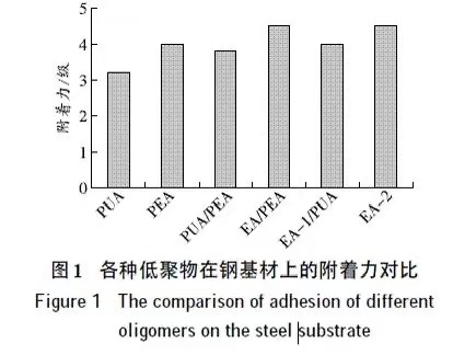 由图1 可见:酚醛环氧丙烯酸酯(EA-2)、环氧丙烯酸酯与聚酯丙烯酸酯混拼(EA/PEA)对金属基材有更好的附着力,其中聚酯丙烯酸酯(PEA)刚固化时附着力较好,冷却后附着力稍变差,主要是因为聚酯类树脂固化收缩应力集中,导致附着力有所下降。