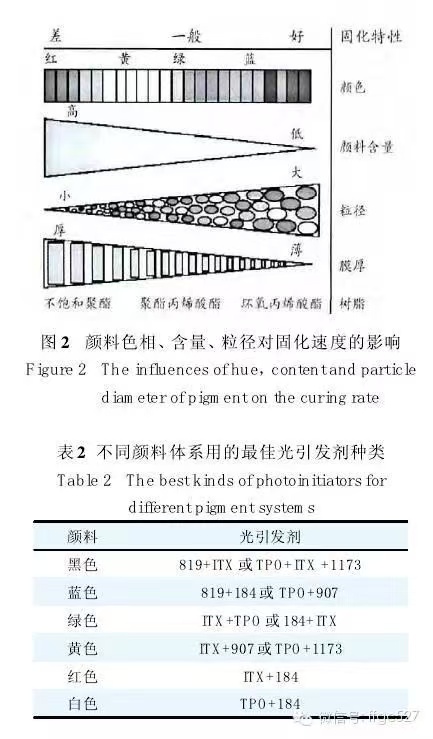 紫外线分为:短波紫外线(UV-C),波长为200~290 nm ;中波紫外线(UV-B),波长为290~320 nm ;长波紫外线(UV-A),波长为320~400 nm ;可见光(Visible light),波长为400~760 nm。工业生产一般使用长波UV(UV-A),色漆配方采用传统的1173 与184 引发剂在此波长的吸收范围会被遮挡而不被吸收引发,所以需要根据不同的颜料来选择不同的光引发剂。在有色涂料体系中,选择单酰基氧化磷和双酰基氧化磷类的引发剂对深层固化具有非常明显的效果。