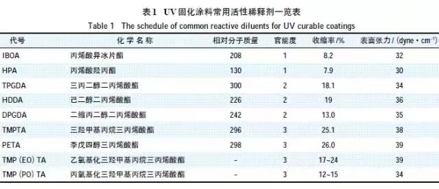 UV 固化涂料常用活性稀释剂如表1所示。