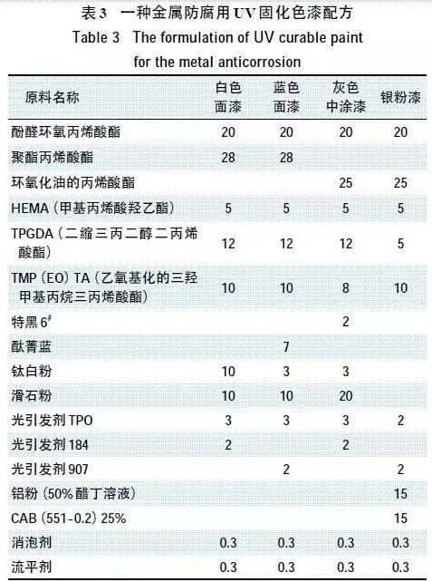 表3为研制的金属防腐用UV 固化色漆配方。
