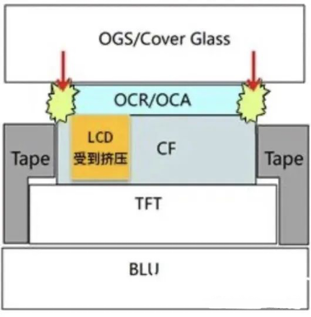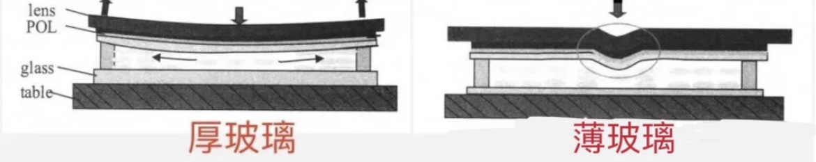 Glass 越厚,应力传导距离远,在应力的作用下,边缘盒厚变大,液晶扩散填充,边缘液晶量变多造成发黄mura;相反的,Glass越薄,应力在弹性形变中被消耗,力无法远距离传播,边缘受影响小,盒厚变化不明显,产生的 mura 轻微或不可见。