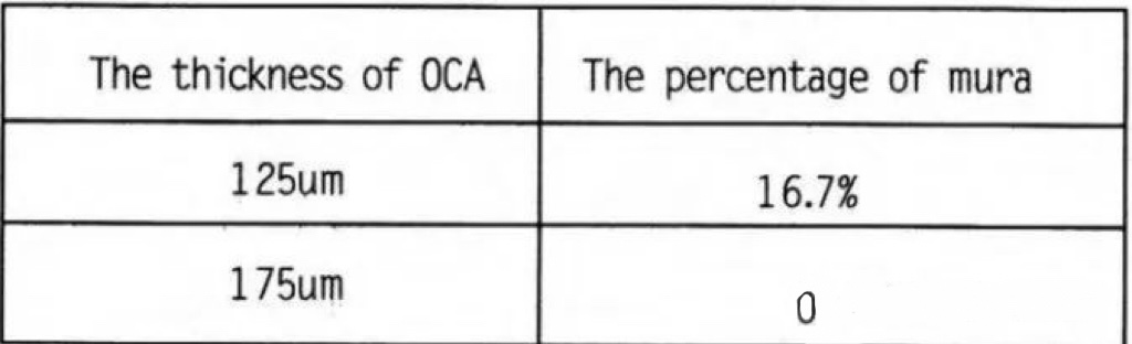 根据实验数据可得结论,相同型号的OCA,全贴合 mura的不良率由 OCA 的厚度决定。OCA越厚,全贴合 mura不良率越低。