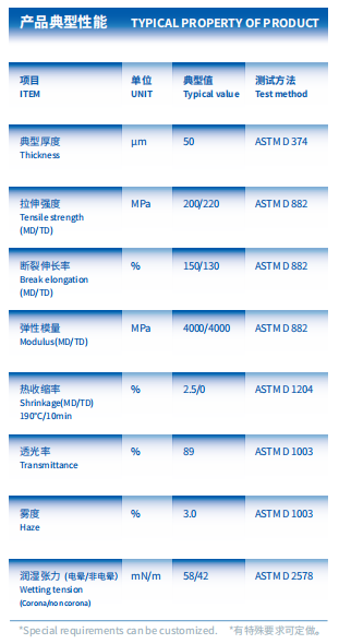 特性:表面平整度好,洁净度高;热稳定性好。 应用:主要用于电子电气保护、胶带等。