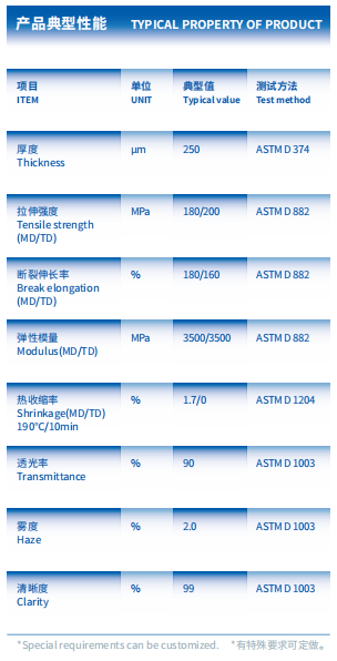 特性:优异的透光率,清晰度高,单/双面涂布处理赋予薄膜优异的附着性能。洁净度高,杂质少,优异的平整性,卓越的热稳定性能。 应用:主要应用于硬化、铭板、印刷等,以及对薄膜光学性能和表面附着性能有特殊要求的领域。